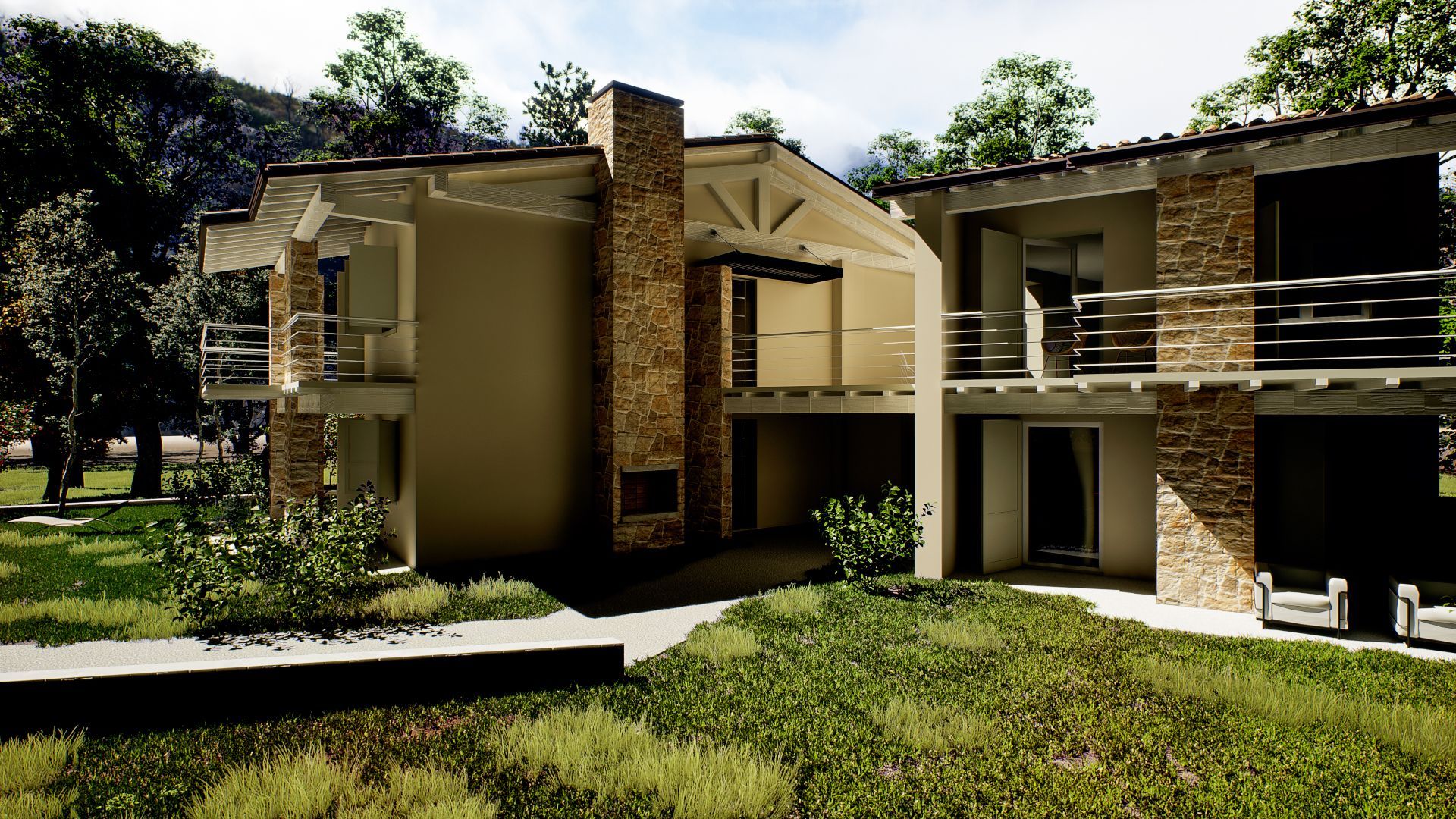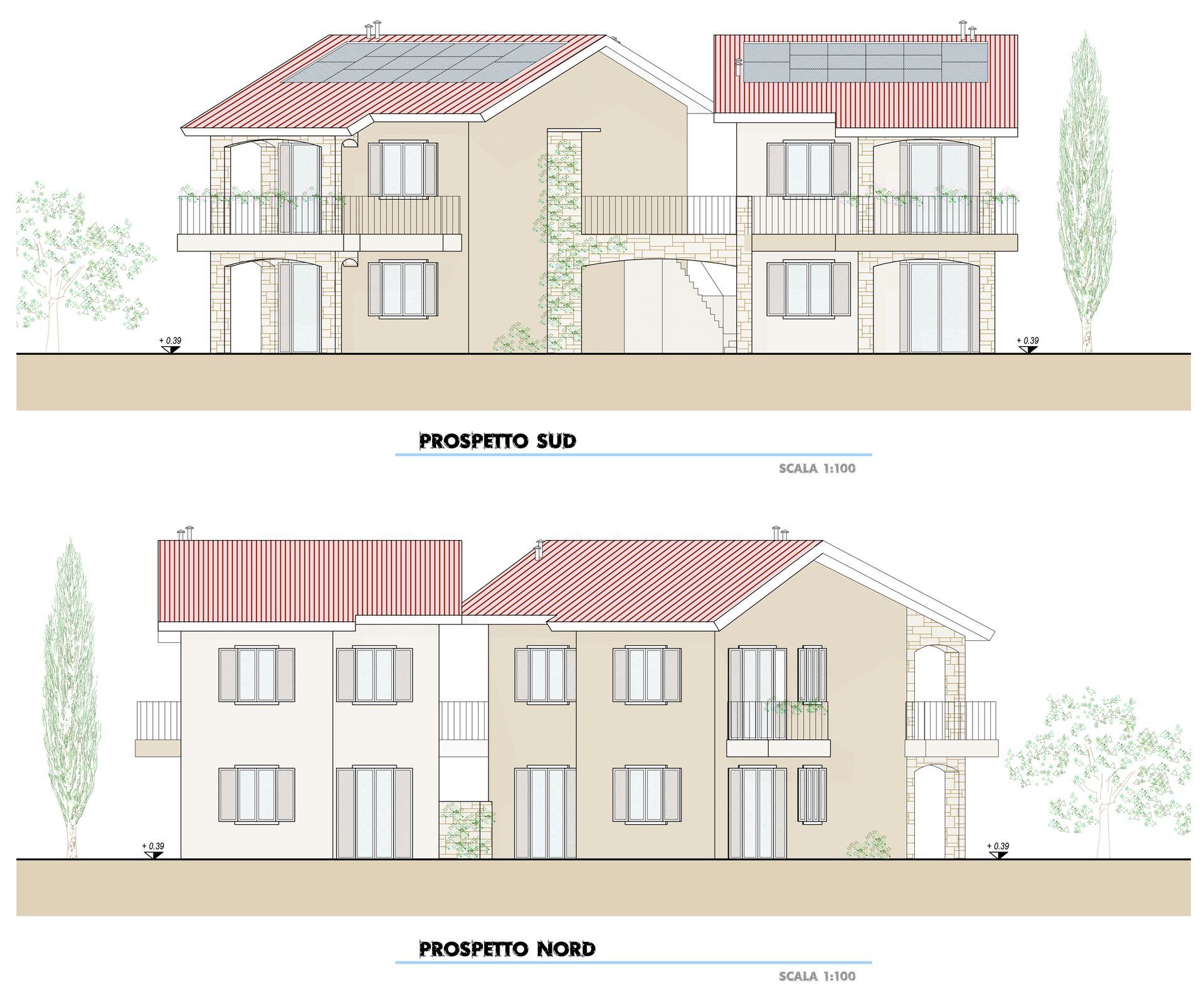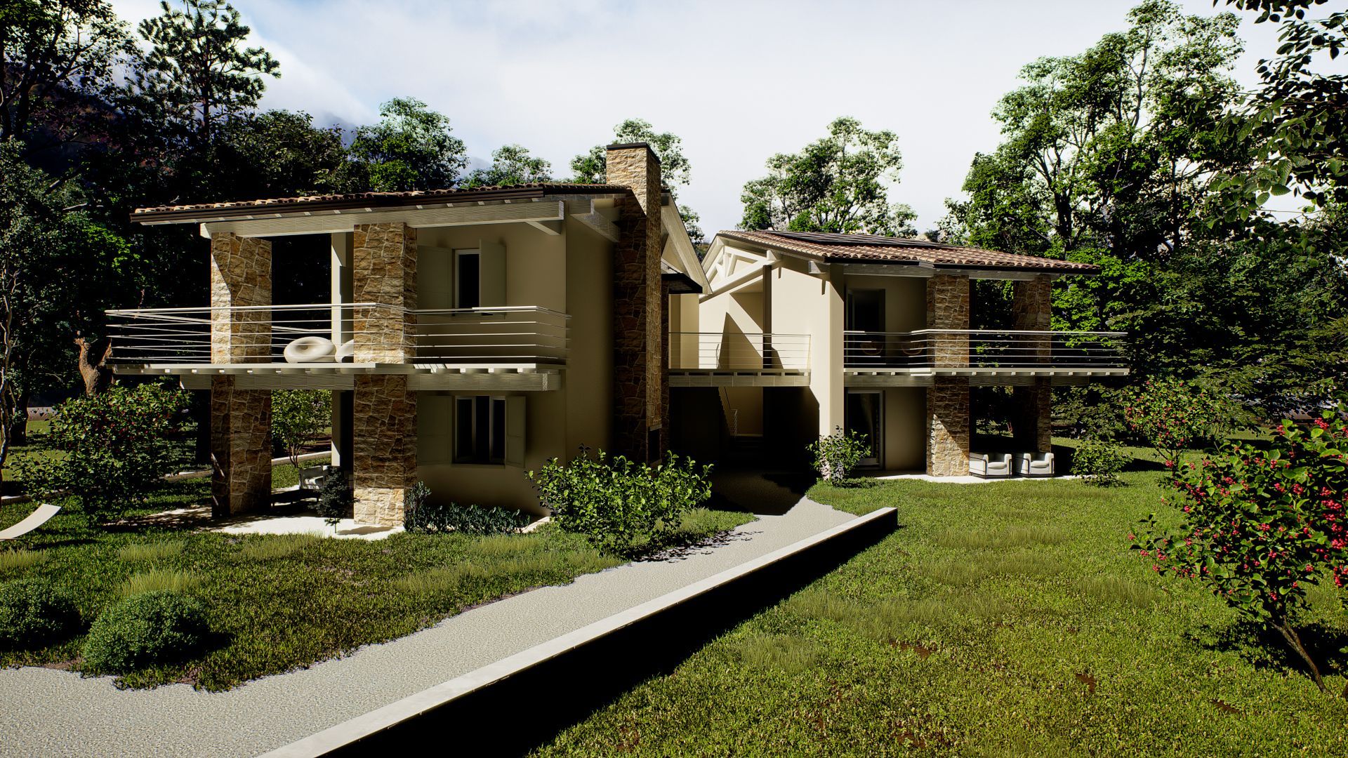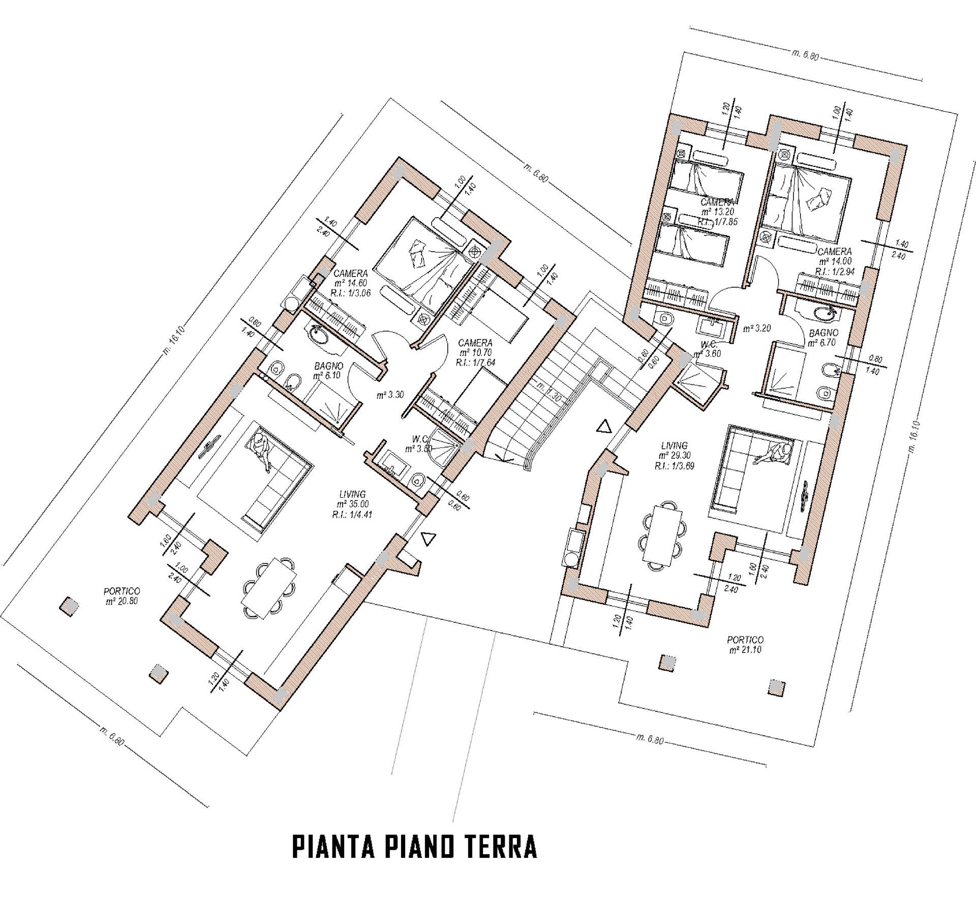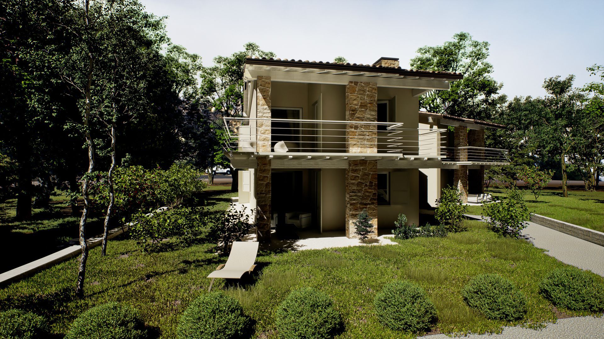 Le due unità a pian terreno hanno ingressi indipendenti e giardini privati di mq. 200 cadauna. Ciascuna unità ha una metratura commerciale di mq 130 circa ed è composta da un’ampia zona living con angolo cottura (eventualmente divisibile) che sfocia sul porticato, due camere da letto e due bagni. Ogni appartamento è inoltre dotato di posti auto privati interni coperti e cantina.
