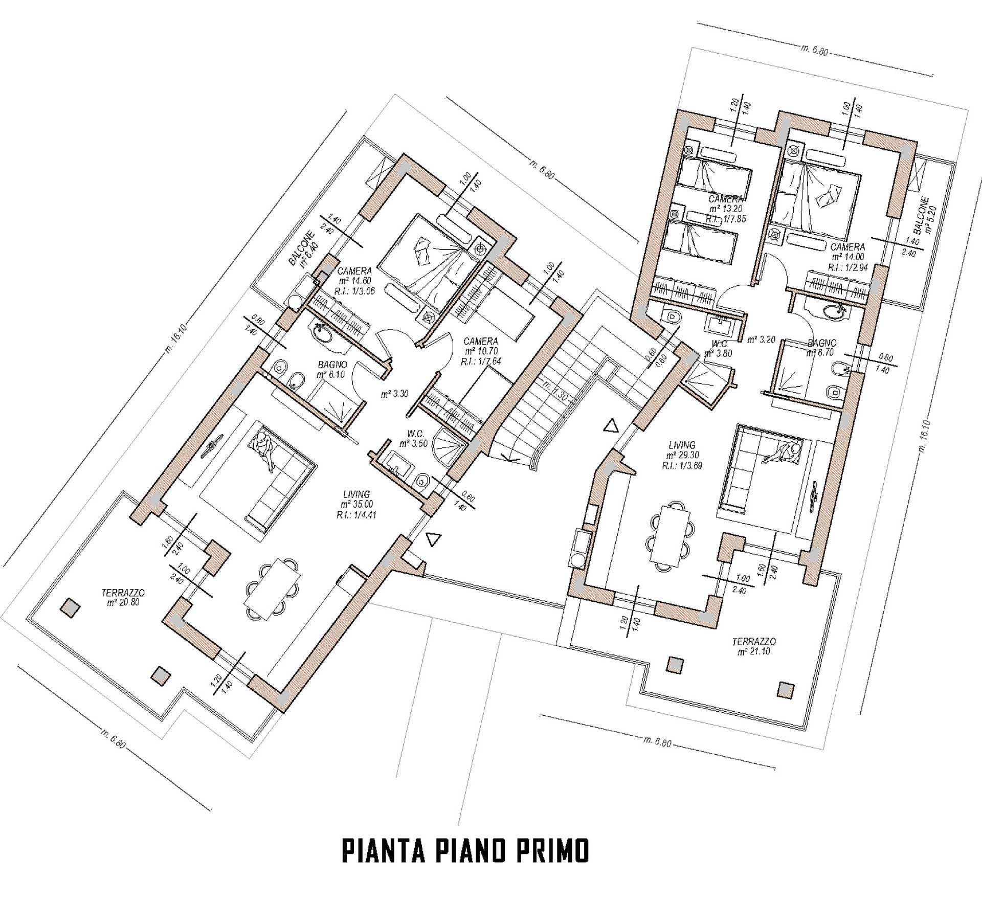 Anche le due unità al piano superiore, di mq. 130 circa, hanno ingressi indipendenti. Esse sono composte da zona living con angolo cottura (anche in questo caso divisibile), ampio terrazzo con vista lago e vista monte, due camere di cui una con balcone e due bagni. Anch’esse sono dotate di posti auto privati interni coperti e cantina.